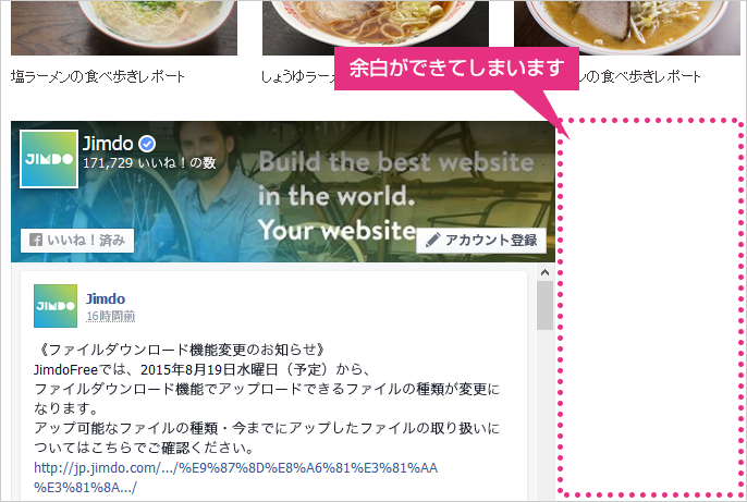 使用しているテンプレートの幅によっては、埋め込んだ Facebook の表示が、ページの途中で終わってしまうため、右側に空白ができてしまいます。これが「何だかイマイチ?!」の原因なのです。