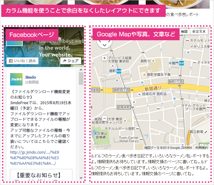 そこで、「カラム機能」を使って、エリアを 2 つに分け片方に Facebook ページ、もう片方には「写真付き文章」や「フォトギャラリー」「Google マップ」など別の要素を入れて並べます。