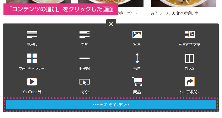 Jimdo にログインし、「コンテンツの追加」⇒「その他コンテンツ」をクリックします。