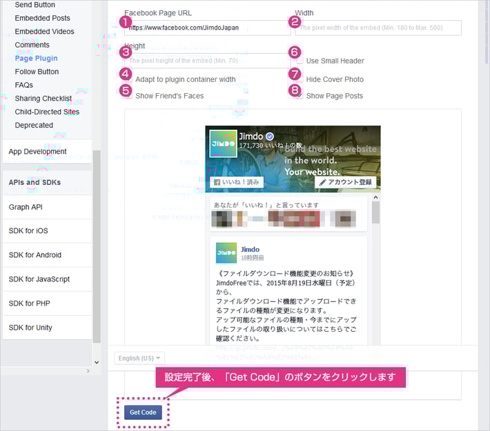 | ⑧Show Page Posts | チェックをつけると、Facebook ページに投稿した記事が表示されます。 |
