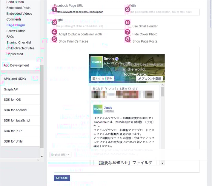 ここまで、Jimdo の機能のみでできる Facebook ページの埋め込み方法について解説してきましたが、基本の機能では「高さ」を変更することができません。高さを変更する必要がある場合には、Facebookの「Page Plugin」という機能を使用し、作成したコードを Jimdo の「ウィジェット」で貼り付けるという方法になります。以下、解説します。